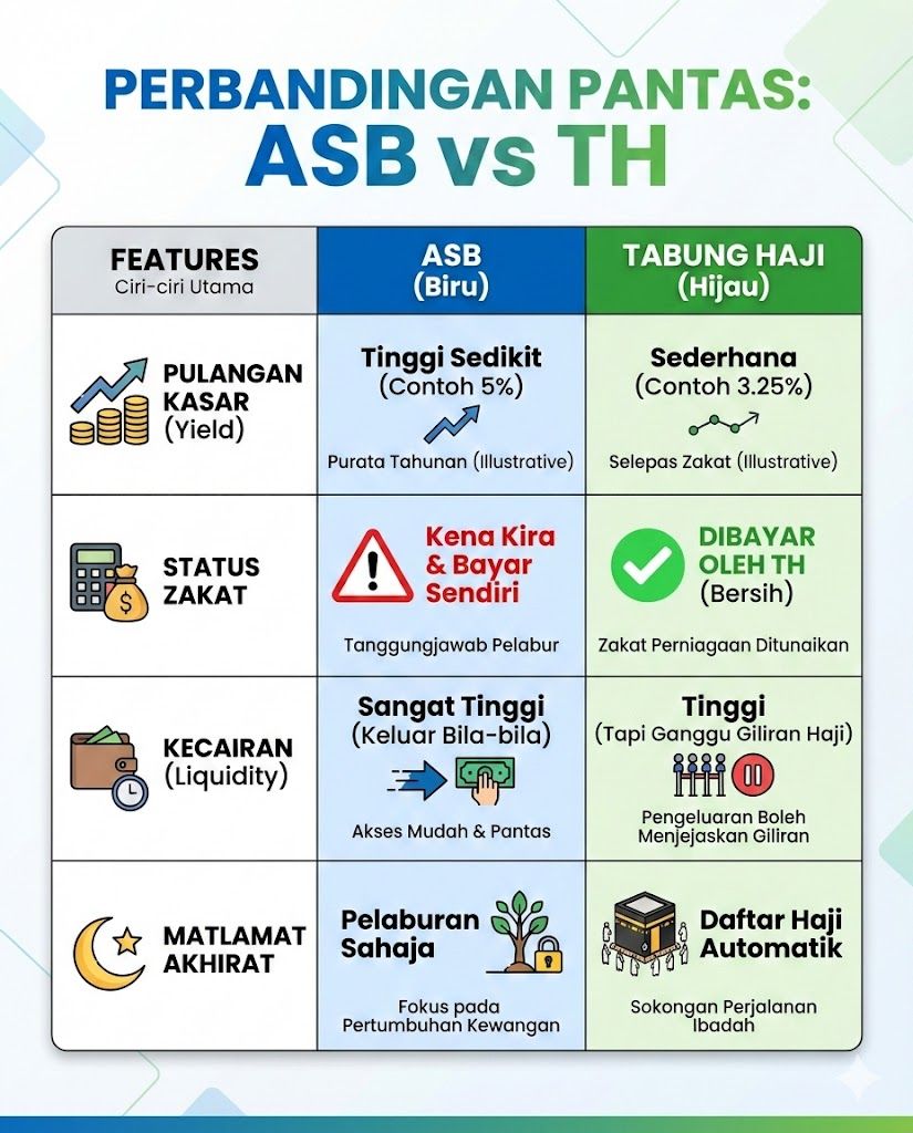 Kesimpulan : Lebih baik jangan pilih satu sahaja. Strategi terbaik adalah Hybrid. Cadangannya adalah, mungkin anda boleh letakkan dana kecemasan (emergency fund) di ASB kerana kecairannya, dan letakkan dana simpanan tetap serta dana haji di Tabung Haji untuk keberkatan dan kemudahan pengurusan zakat.