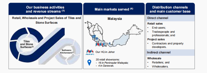 Liputan Pasaran: Pada Tarikh Praktikal Terkini (LPD), Kumpulan mempunyai 20 bilik pameran runcit di seluruh Malaysia — 16 di Semenanjung (Johor, Selangor, Kuala Lumpur, Negeri Sembilan) dan 4 di Sarawak, membolehkan servis kawasan dengan aktiviti pembinaan dan pengubahsuaian tinggi.