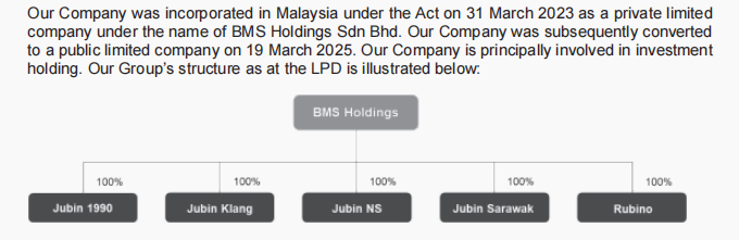 Struktur semasa Kumpulan, yang merangkumi lima anak syarikat utama (Jubin 1990, Jubin Klang, Jubin NS, Jubin Sarawak, dan Rubino), disatukan di bawah BMS Holdings Berhad melalui skim pengambilalihan yang diselesaikan pada Oktober 2025.