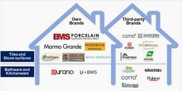 Portfolio Jenama: 75.05% hasil FYE 2025 datang dari jenama sendiri (contohnya, BMS PORCELAIN, Rubino) dan disokong oleh jenama pihak ketiga (contohnya, COTTO).