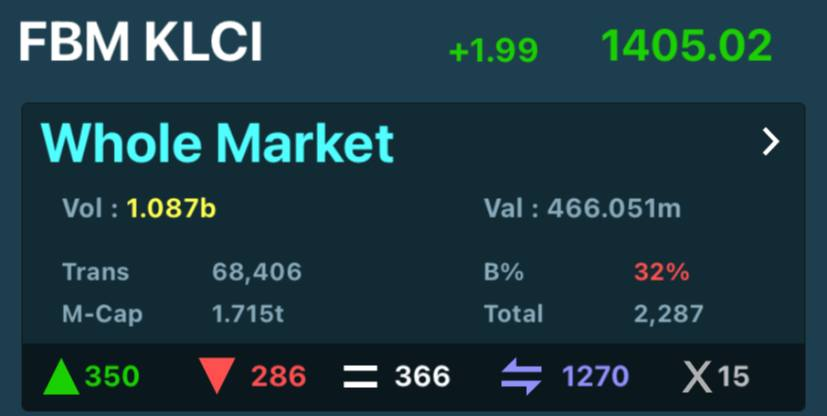 Kaedah kedua, untuk mengetahui sama ada pasaran saham Bursa Malaysia tengah mendapat sambutan atau tidak secara harian, boleh pergi ke platform Mplus anda. Di situ, terdapat petanda yang menunjukkan bilangan kaunter yang sedang menaik dan menurun. Anak panah hijau keatas menunjukkan bilangan kaunter yang menaik dan anak panah merah ke bawah pula menunjukkan yang menurun.