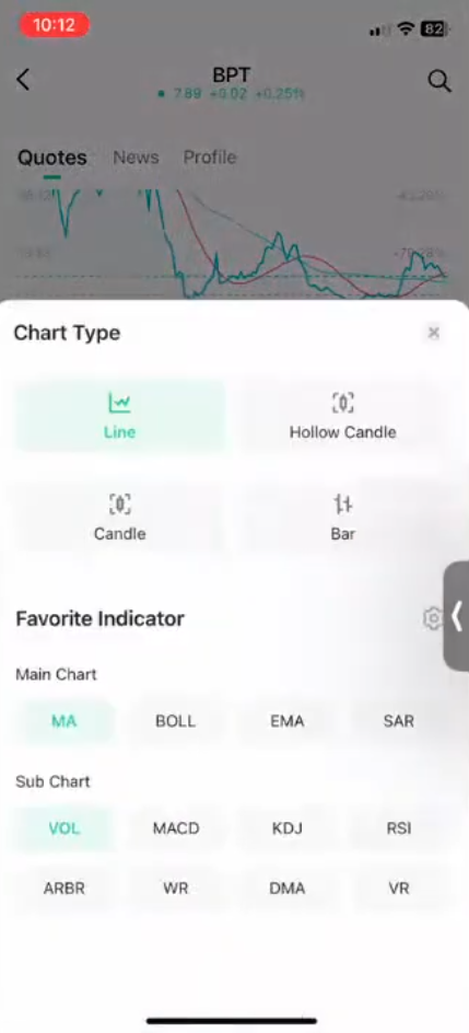 Terdapat simbol ‘Gear’ yang boleh ditekan untuk memilih ‘jenis carta’ yang ingin dilihat dan juga indikator yang digemari.