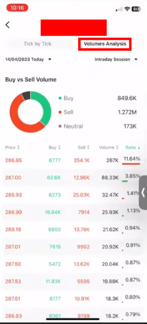 Anda juga boleh melihat bahagian ‘Volumes Analysis’ yang menunjukkan analisa pembelian dan penjualan unit saham tersebut. Boleh dilihat ‘ketebalan’ atau transaksi yang banyak berlaku di satu tangga harga. Seperti dalam gambar diatas, volume banyak berada di harga 28685 USD.