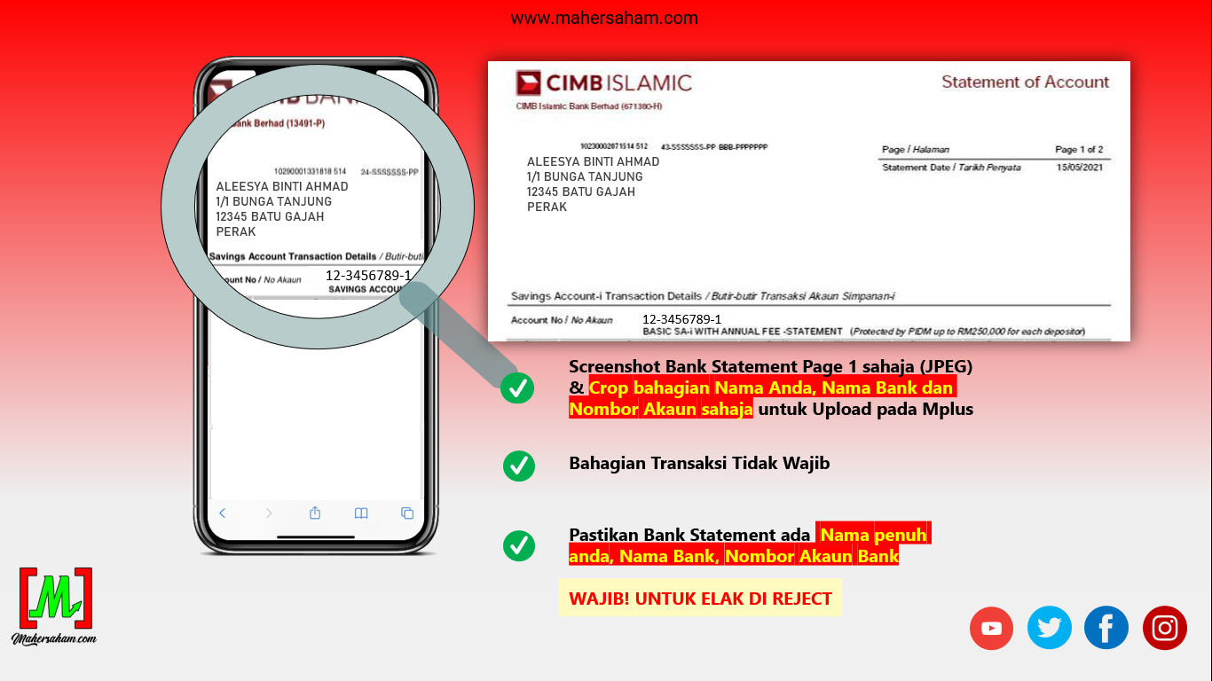 Bank statement diperlukan oleh Mplus untuk tujuan pengesahan identiti pemohon. Ia memastikan nama penuh, nama bank dan nombor akaun bank pemohon adalah sah dan sepadan dengan maklumat dalam borang permohonan CDS.