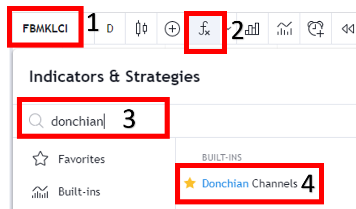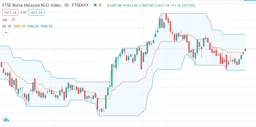 Klik butang Indicators di TradingView, cari Donchian Channel dan tambahkan pada carta. Secara default ia menggunakan tempoh 20 hari tetapi anda boleh ubah mengikut strategi dagangan anda.