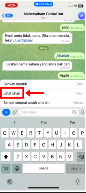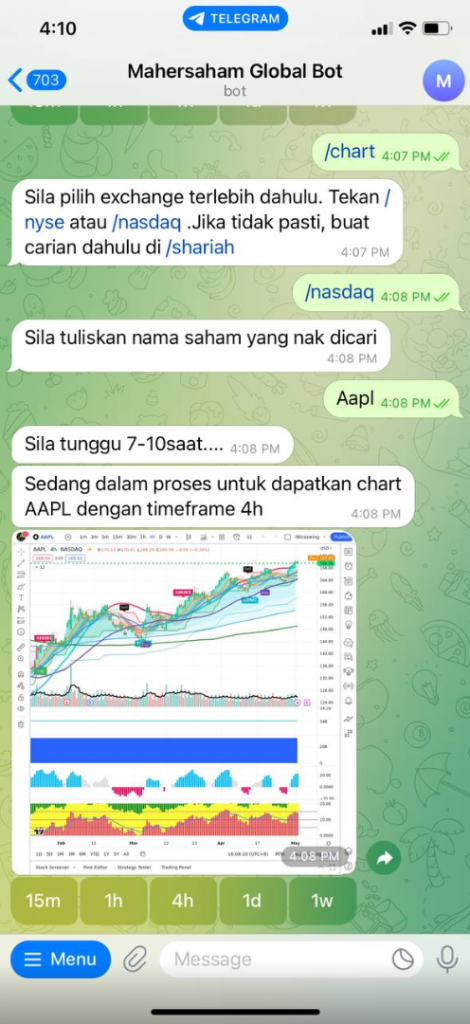 Dengan hanya menggunakan aplikasi yang hampir semua pedagang saham gunakan iaitu ‘Telegram‘, anda sudah boleh melihat chart kaunter berserta indikator yang membantu. Jom saya tunjukkan satu persatu macam mana nak gunakan Mahersaham Global Bot ini.
