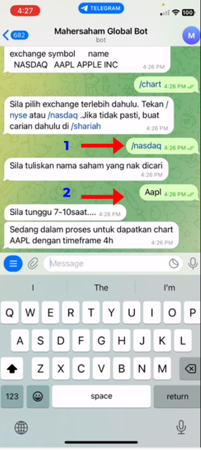 Buka bot di Telegram, pilih pasaran (/nyse atau /nasdaq), masukkan simbol kaunter dan tunggu beberapa saat untuk mendapatkan chart lengkap dengan indikator teknikal.