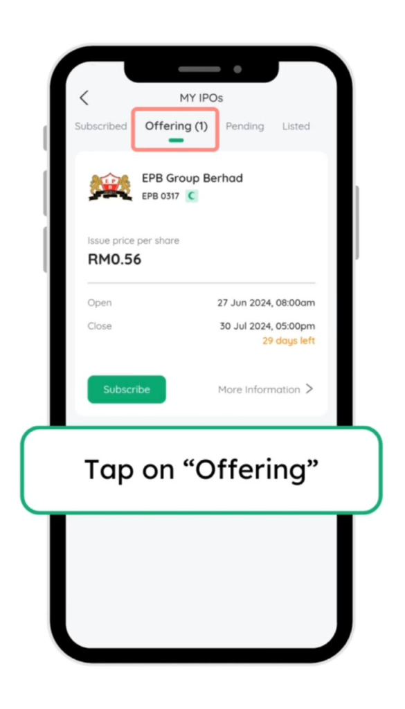 4. Tekan Offering. Paparan ini akan menunjukkan semua IPO yang boleh dimohon buat masa terkini.