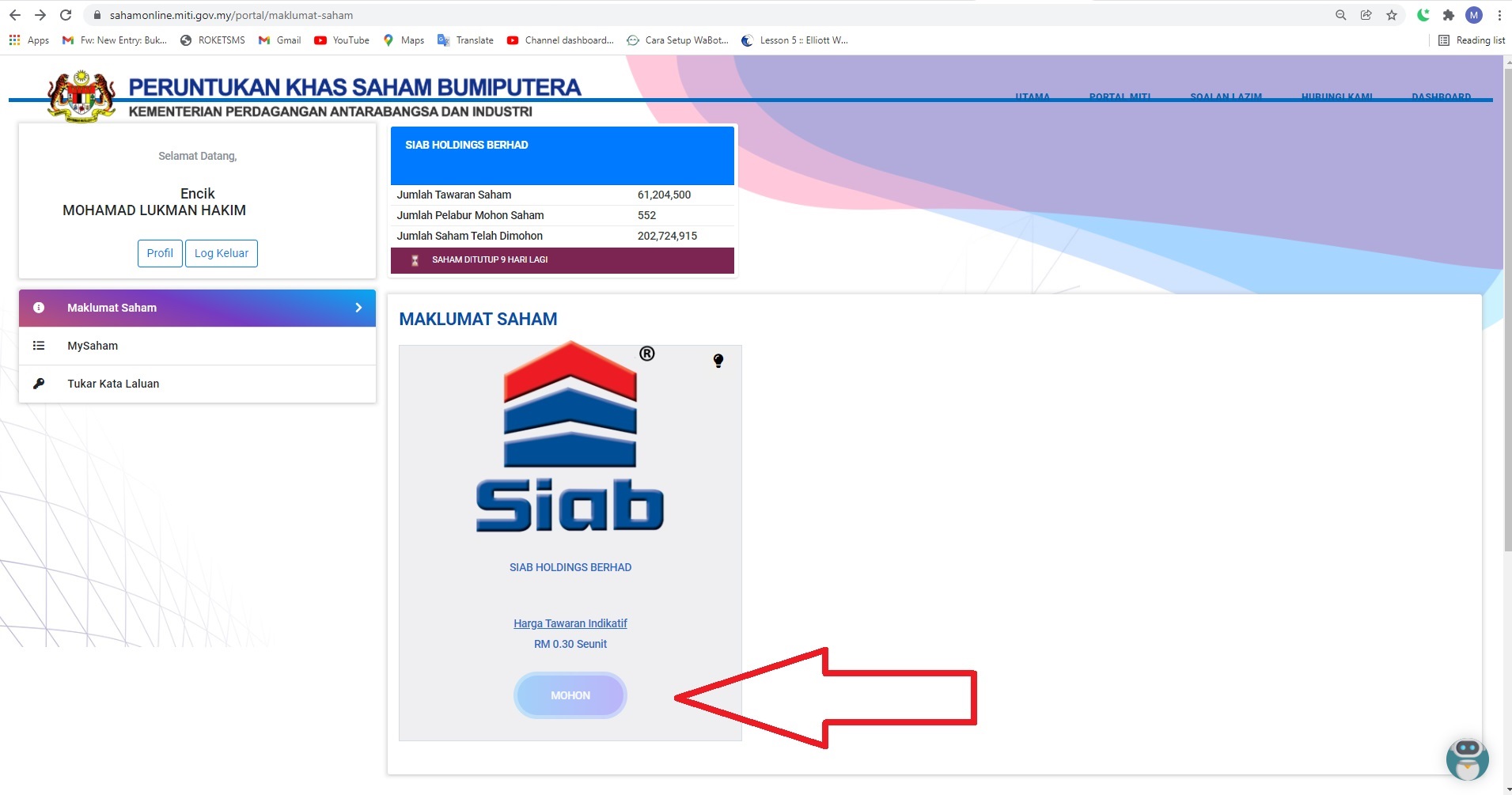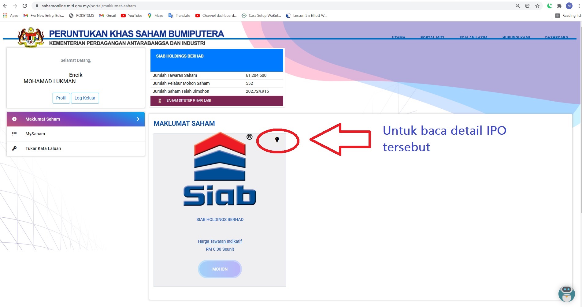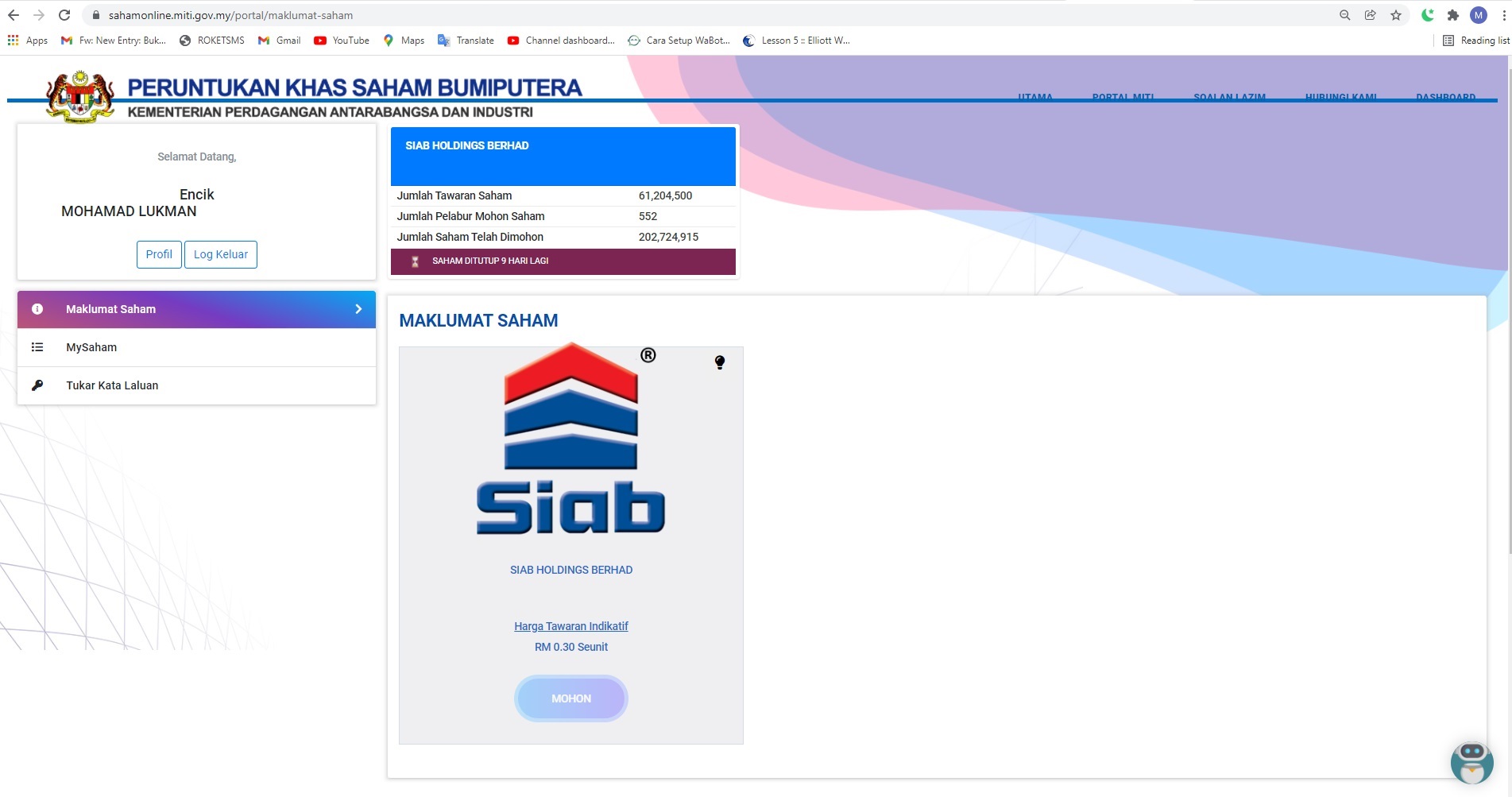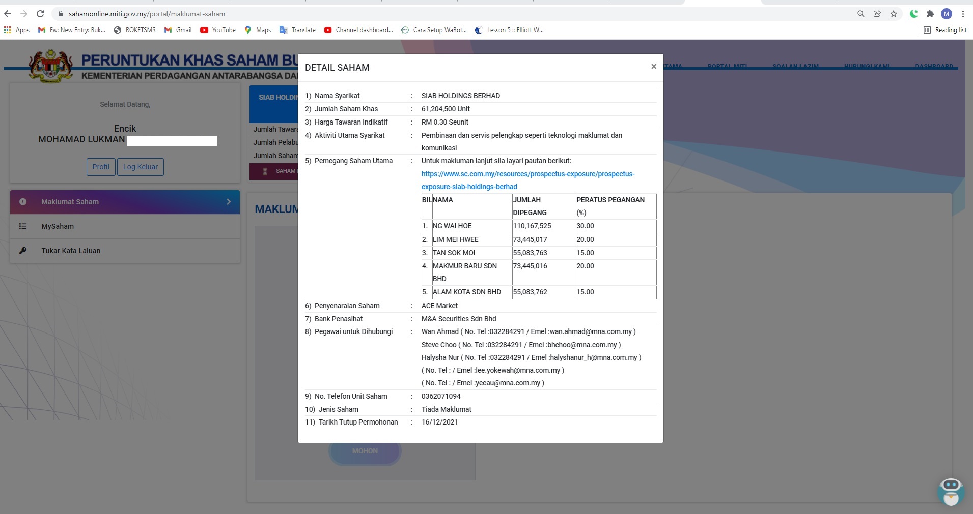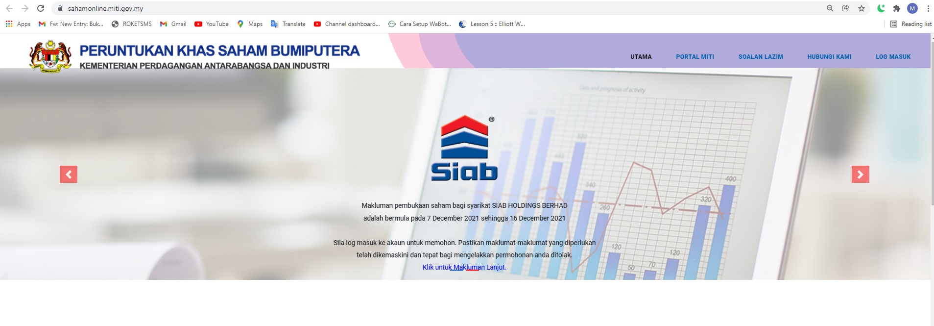 Lihat apa makluman terbaru seperti contoh gambar di bawah makluman tentang syarikat SIAB HOLDINGS BERHAD di buka untuk di MOHON di MITI