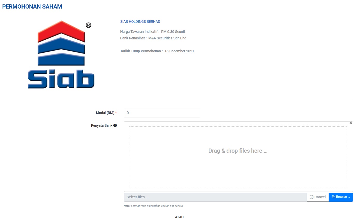 Keenam masukkan modal yang ingin mohon untuk IPO ini. Sila kira mengikut peruntukkan modal anda sendiri dan sila penyata bank terkini