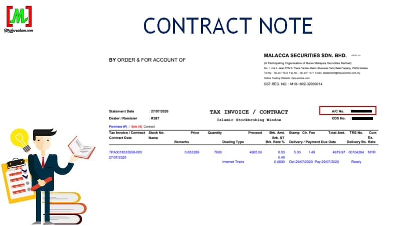 Yang ketiga, Client Code boleh disemak di Contract Note anda sendiri.Baca tentang Contract Note bagi yang tak tahu.Jika anda pernah beli atau jual saham, anda akan terima Contract Note ini dari Broker yang menyatakan segala maklumat transaksi beli atau jual saham yang anda lakukan.Biasanya Contract Note ini akan dihantar di emel anda dan juga akan update di App Mplus bahagian Contract Note (bagi yang menggunakan Broker Mplus).Sila rujuk gambar dibawah untuk semak Client Code di Contract Note.