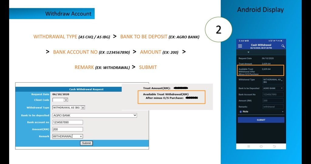 Dalam keadaan tersebut, amount yang boleh dikeluarkan daripada akaun trust akan berbeza seperti yang dipaparkan dalam platform Mplus.