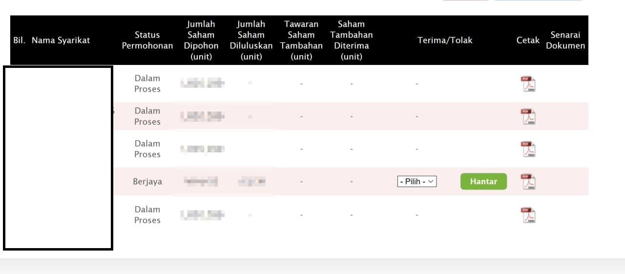 Status berjaya bermakna anda dapat IPO tersebut dan seterusnya perlu pilih di bahagian Terima/Tolak dan klik hantar.