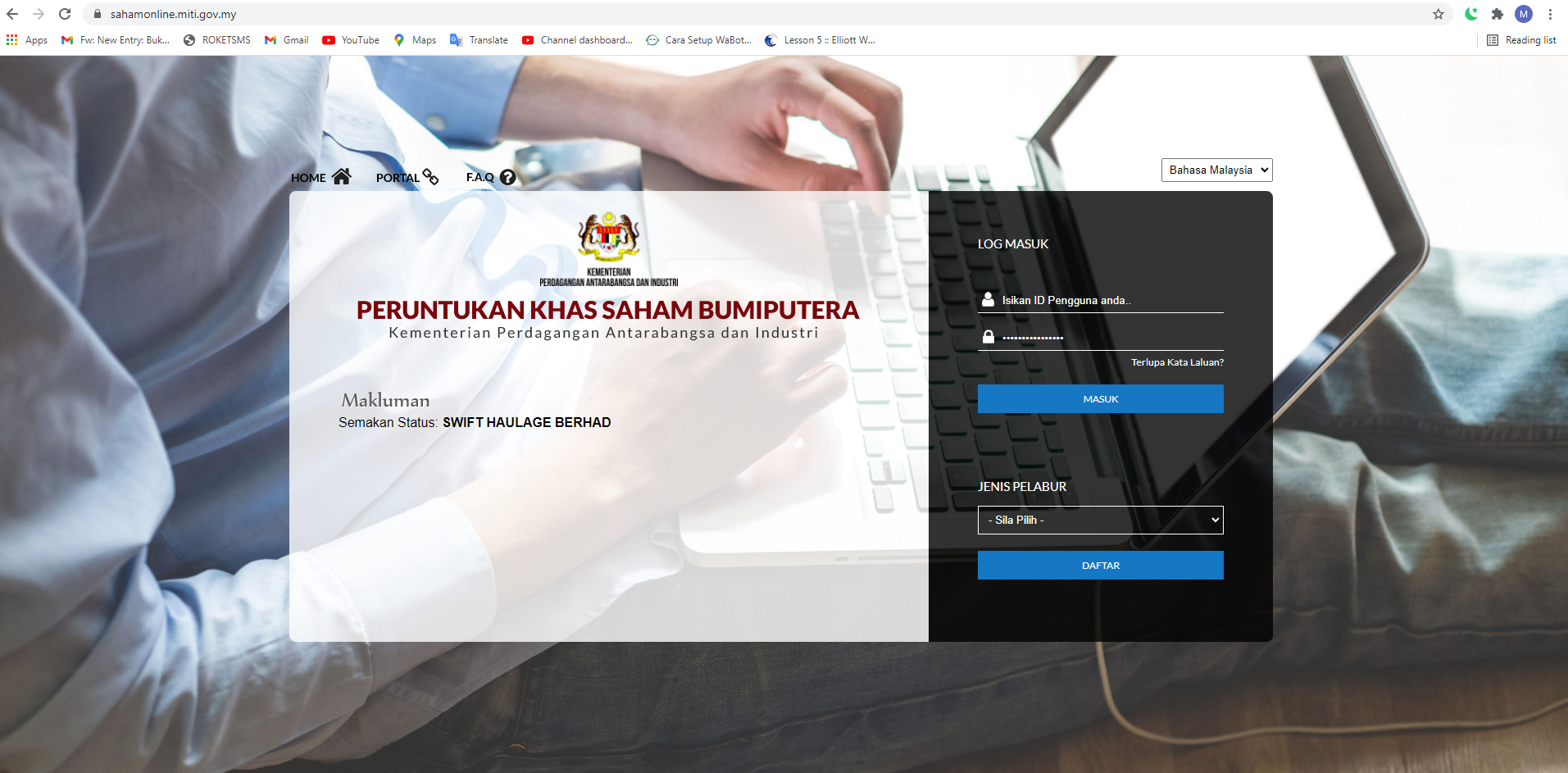 Contoh website miti. Disini anda akan nampak ada pengumuman atau makluman terkini. Dalam gambar ini makluman adalah semakan status IPO SWIFT HAULAGE BERHAD