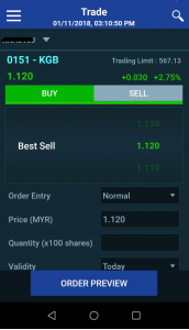 Kini anda boleh membuat jual beli saham menggunakan aplikasi telefon sahaja. Cari kaunter yang anda kehendaki, buat pilihan sama ada buy atau sell kemudian masukkan harga pilihan, bilangan kuantiti saham yang ingin dibeli atau yang ingin dijual serta tempoh validity.