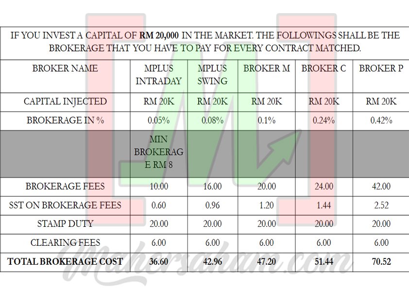According to the calculation provided in the chart above, the total brokerage cost for Mplus broker is the cheapest at RM36.60 for intraday and RM42.96 for swing.