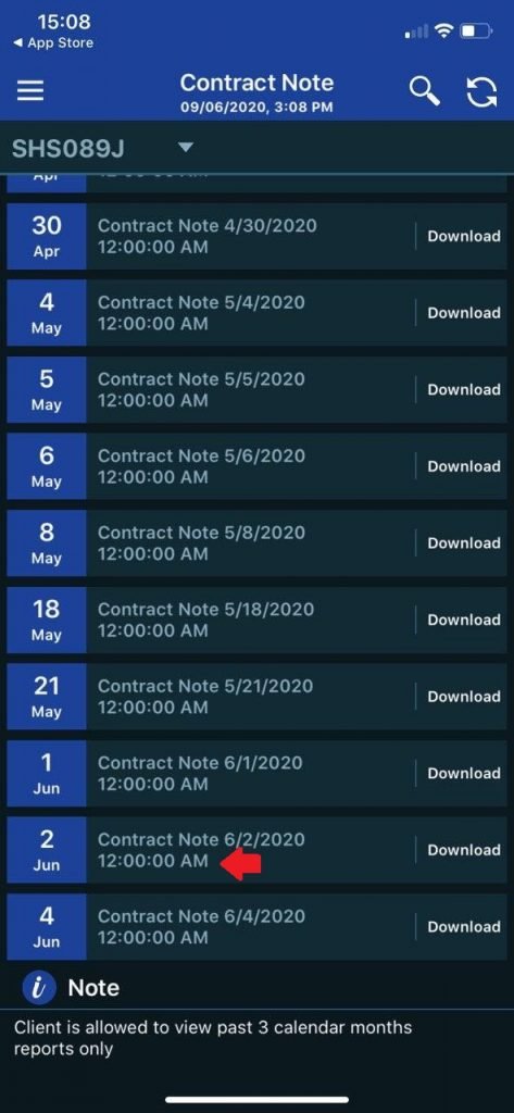 You can access your contract note through the Mplus Global app or the older Mplus Online platform. After logging in, click on "Contract Note" in the menu. Notes are typically generated after 12 midnight on the trading day. The PDF document is password-protected with your IC number (without dashes).