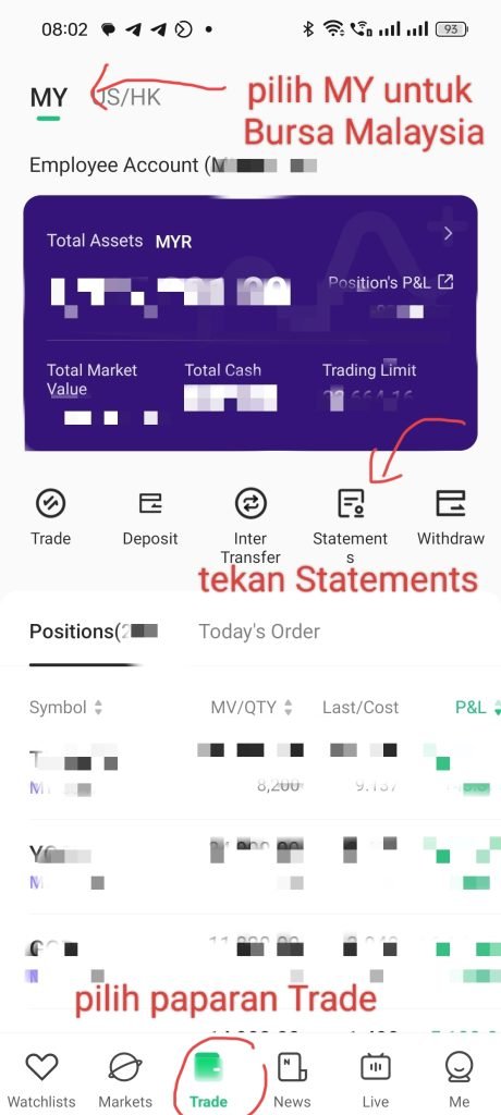 1. Brk. Amt: The brokerage charge imposed is a minimum of RM8 or 0.08%. However, for Intraday you will only be charged 0.05%. Other than Intraday, the charge is 0.08%. For example, if you hold, you will be charged 0.08%.