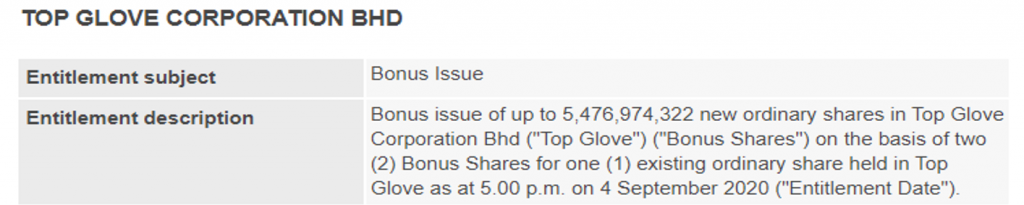 Our case study this time is the bonus issue carried out by Top Glove Corporation BHD.