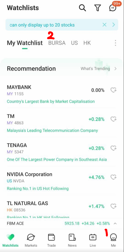 8. Jika sebelum ini anda bukan client Mahersaham, sila pergi ke ‘me’ (no 1 dalam gambar dibawah) , isi invitation code : R387