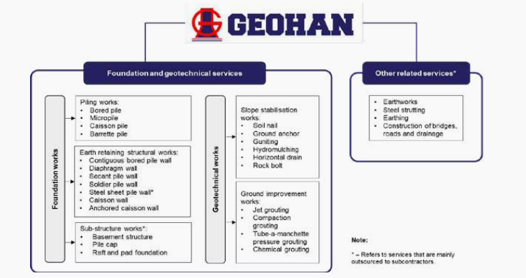 Syarikat ini melalui anak-anak syarikatnya terlibat dalam kerja-kerja seperti piling, bored piling, earth retaining structures, ground treatment dan lain-lain perkhidmatan sub-struktur — iaitu aktiviti pembinaan di bawah paras tanah untuk menyediakan tapak yang stabil bagi bangunan dan infrastruktur.
