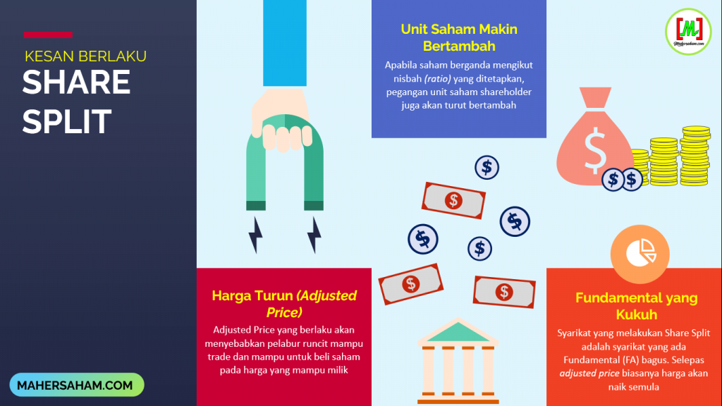 For example, the counter MYTECH announced a share split of 5:1 last November. This means every 1 unit of shares will be split into 5 units in the shareholder''s portfolio.