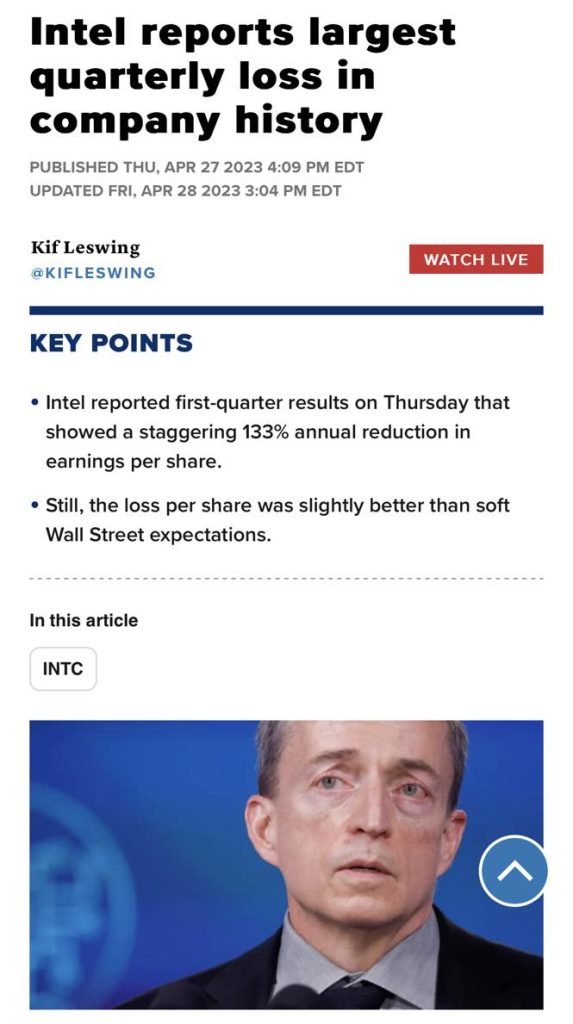 Intel Corporation melaporkan kerugian suku pertama 2023 semalam. Kerugian suku paling teruk dalam sejarah Intel.