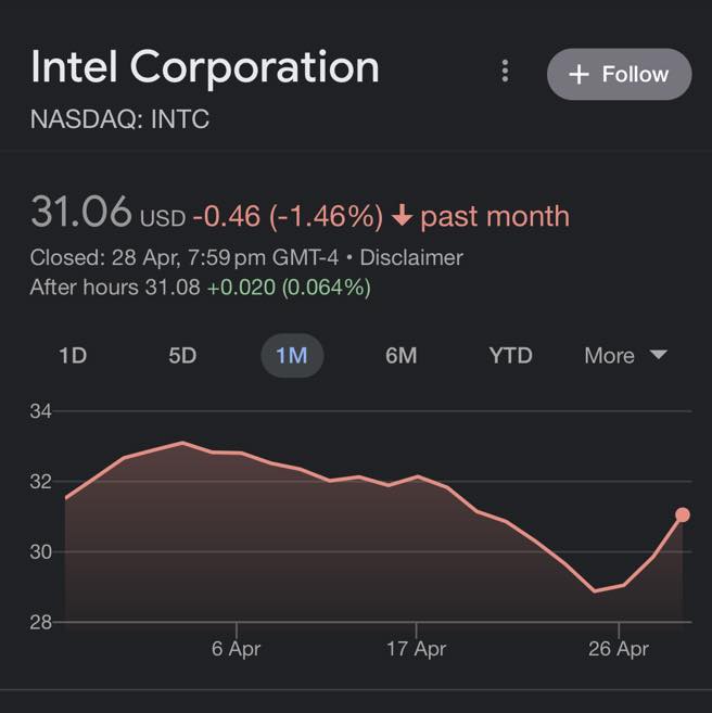 Lihat pada carta harga saham Intel sejak beberapa minggu yang sudah menunjukkan kejatuhan kerana pelabur menilai berdasarkan pada jangkaan laporan kerugian teruk yang bakal dikeluarkan.