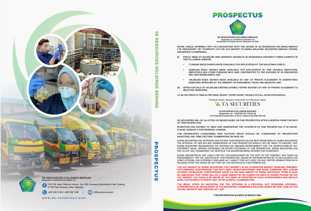 Analisis ini disediakan berdasarkan maklumat yang terkandung dalam Prospektus 5E Resources Holdings Berhad bertarikh 30 Mac 2026 semata-mata. Ini bukan nasihat pelaburan. Pelabur dinasihatkan membaca prospektus penuh sebelum membuat sebarang keputusan pelaburan.