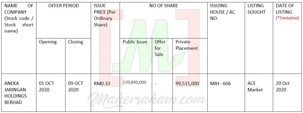 Seperti yang kita tahu, saham IPO Aneka Jaringan Holding Berhad telah dibuka pada awal bulan Oktober dan baru sahaja listing dalam Bursa Malaysia dalam ACE Market pada 20 Oktober 2020 hari tu, boleh rujuk jadual di bawah ini.
