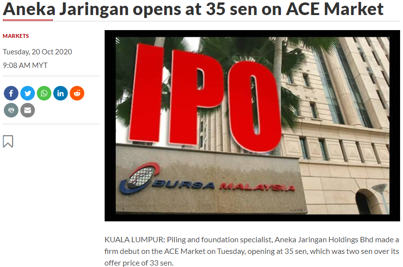 Berdasarkan berita yang dikeluarkan pada 20 Oktober 2020 pada pukul 9.08 pagi oleh The Star Seperti gambar di atas, Aneka Jaringan telah membuat debut kukuh dalam ACE Market pada hari Selasa.