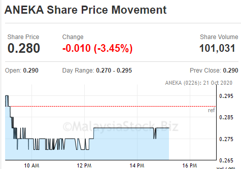 Namun jika kita rujuk teknikal chart share price movement bertarikh 21 Oktober 2020, harga saham semasa adalah RM 0.28 menunjukkan penurunan sebanyak 5 sen berbanding harga penawarannya.