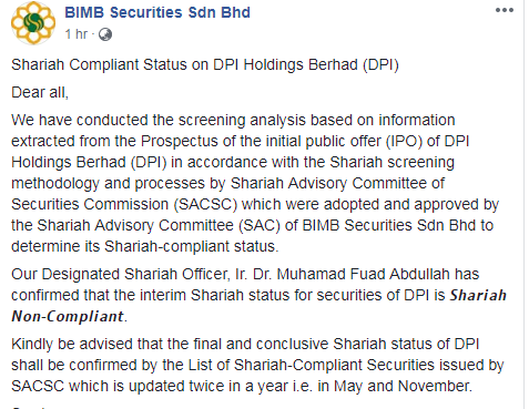 Bagi muslim status syariah sangat penting dalam menjaga harta kita. Untuk IPO DPI HOLDINGS BERHAD ini ia berstatus NON-SYARIAH dari kenyataan yang di keluarkan oleh BIMB Securities Sdn Bhd melalui facebook pagenya.
