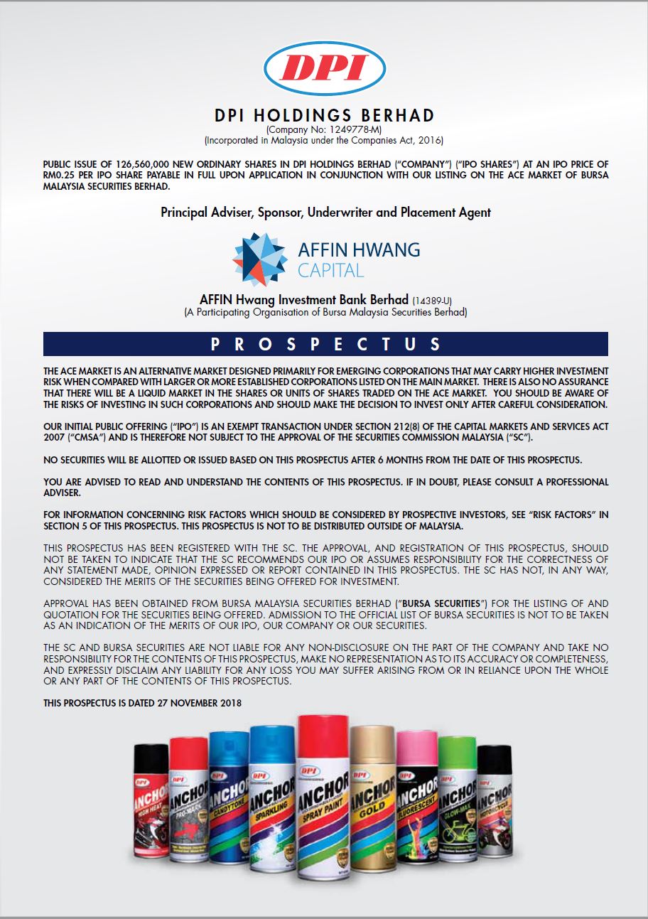 Saham Terbitan Awal atau IPO untuk syarikat DPI HOLDINGS BERHAD yang akan disenaraikan di Bursa Malaysia telah dibuka.