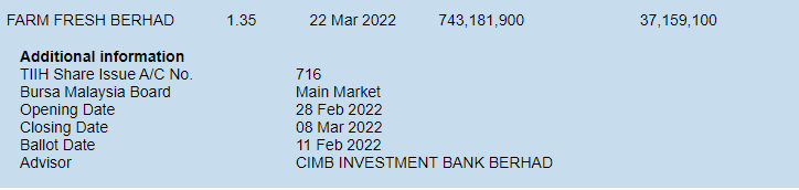 Sejarah IPO Farm Fresh Berhad di Online Banking