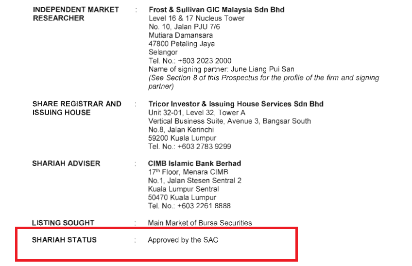 Berdasarkan prospectus, IPO ini mendapat shariah dari Shariah Advisory Council of SC