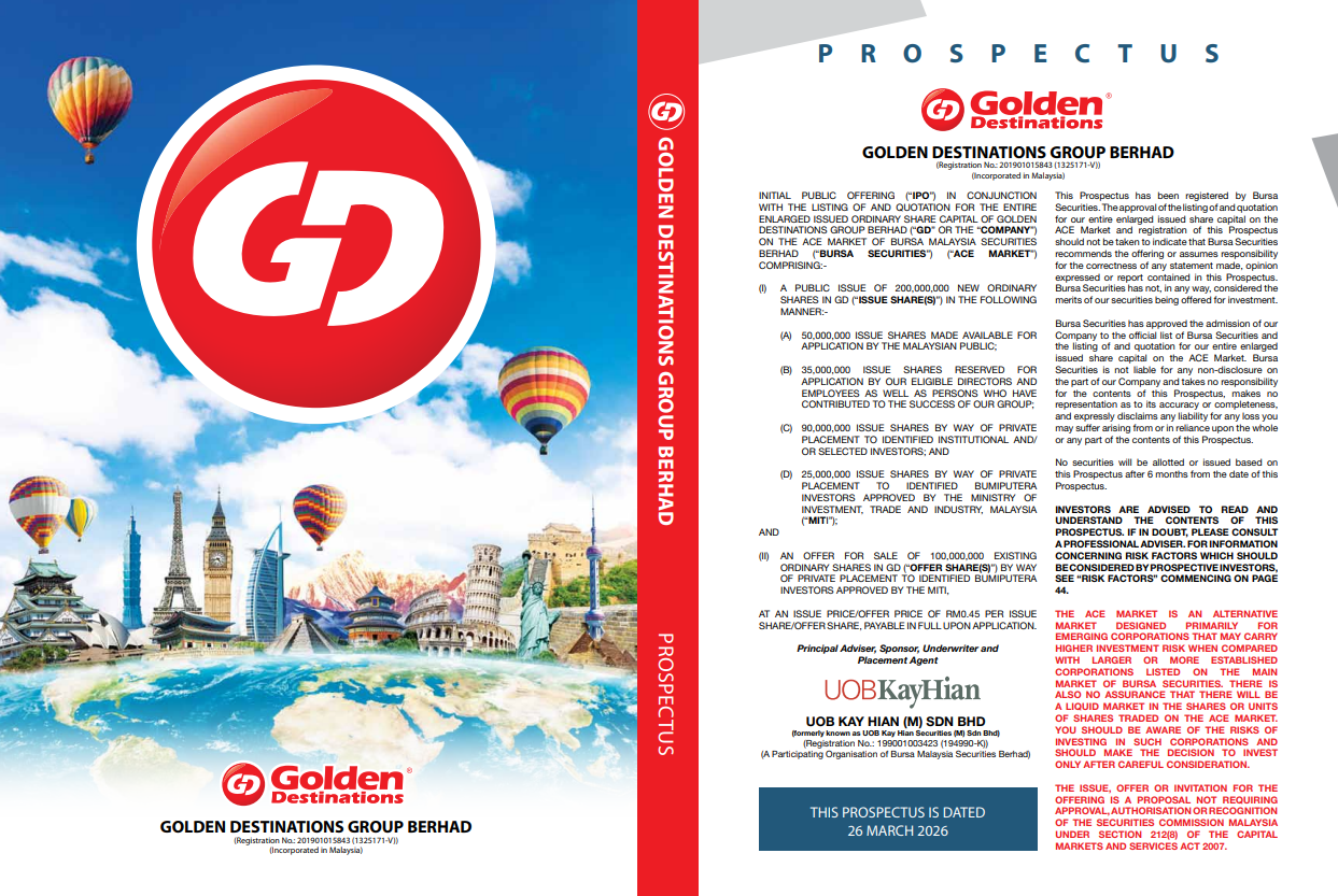 Nota: Semua maklumat dan data dalam artikel ini bersumber secara eksklusif daripada Prospektus Golden Destinations Group Berhad bertarikh 26 Mac 2026 yang didaftarkan dengan Bursa Malaysia Securities Berhad. Artikel ini adalah untuk tujuan pendidikan dan maklumat sahaja, bukan nasihat pelaburan. Sila buat penyelidikan anda sendiri (DYOR) sebelum membuat sebarang keputusan pelaburan.