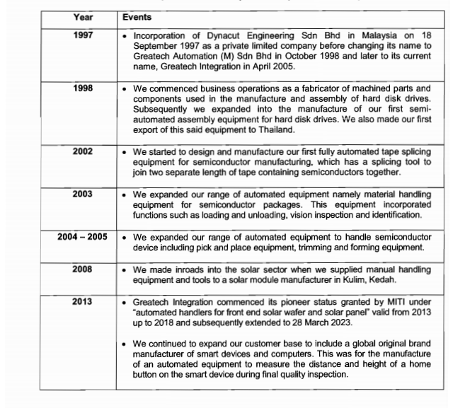 Bermula sebagai private limited pada 5 MAC 2018 dengan nama GREATECH TECHNOLOGY SDN BHD kemudian bertukar menjadi public limited pada 21 MEI 2018 dengan nama GREATECH TECHNOLOGY BERHAD. Jadi setahun selepas menjadi public limited sekarang mei 2019 GREATECH MEMBUAT TAWARAN AWAM AWAL sebelum masuk ke IPO.