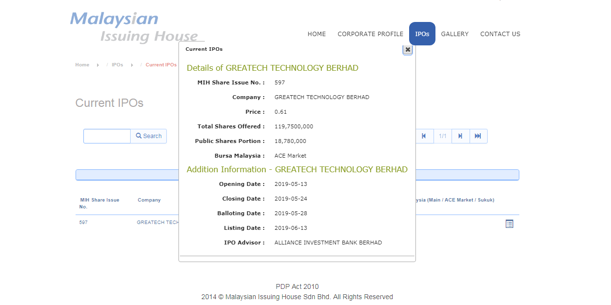 Initial Public Offering untuk Bursa Malaysia telah dibuka iaitu syarikat Greatech Technology Berhad.