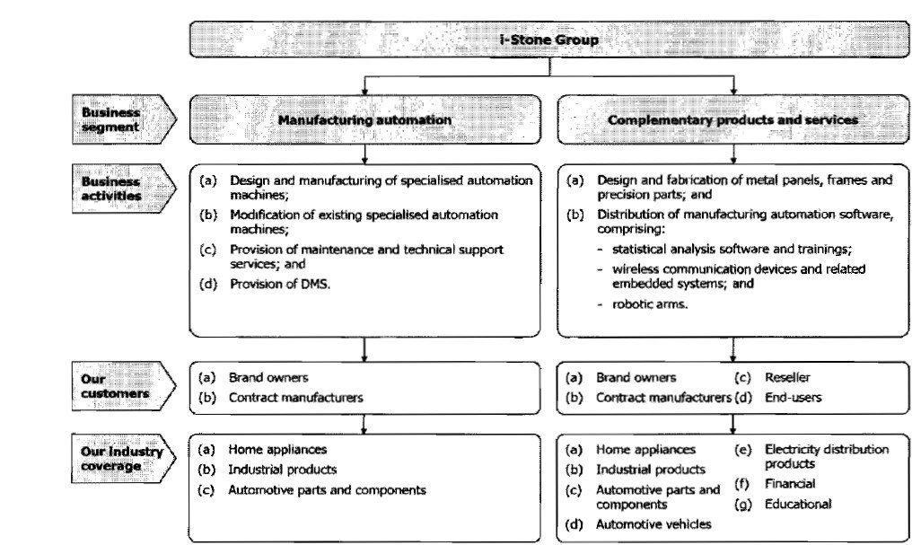 Core business I-STONE GROUP BERHAD adalah Manufacturing Automation & Complementary products and services. Manufacturing Automation memfokus kepada design, manufacturing dan modification. Manakala untuk complementary ia memfokus kepada design dan fabrication.