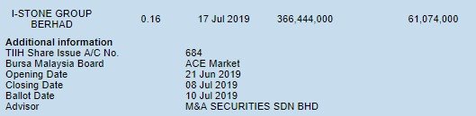 Initial Public Offering, IPO I-Stone Group Berhad telah dibuka untuk semua. Syarikat ini berfokus pada penghasilan mesin automasi untuk proses pembuatan.