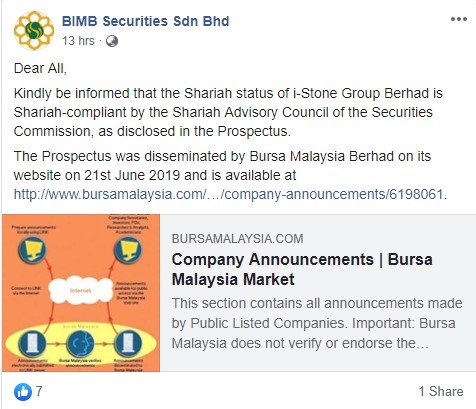 Bagi muslim status syariah sangat penting dalam menjaga harta kita. Untuk IPO I-Stone Group Berhad ini ia berstatus patuh syariah berdasar sumber di ambil dari laman facebook BIMB SECURITIES Sdn Bhd.