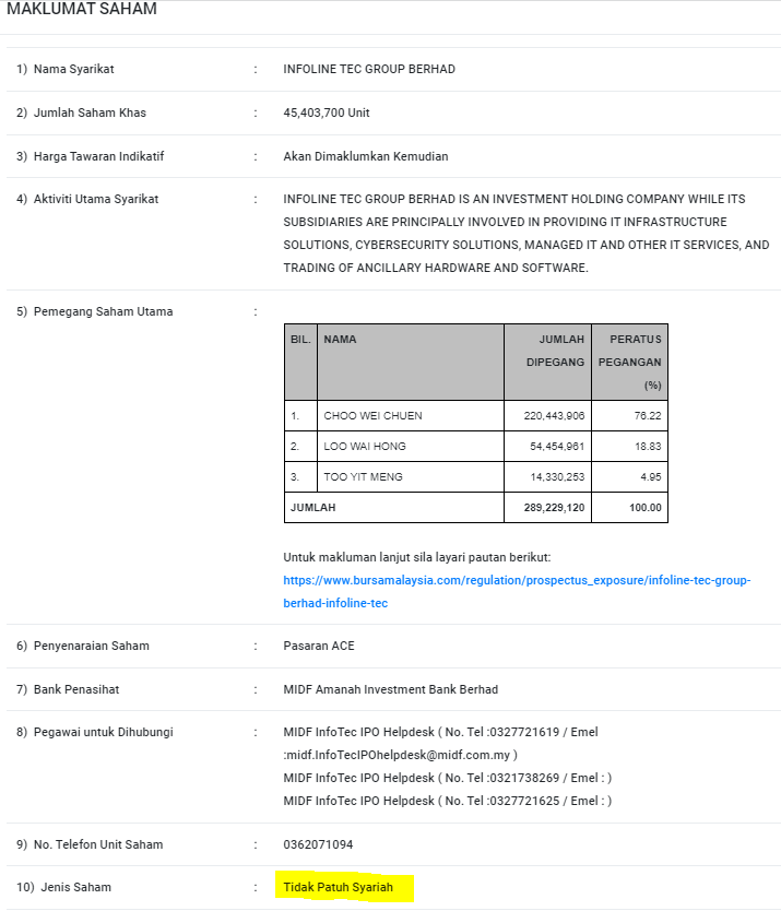 Berdasarkan maklumat tawaran IPO Infoline Tec Group Berhad di MITI sebelum ini, IPO ini TIDAK patuh syariah.
