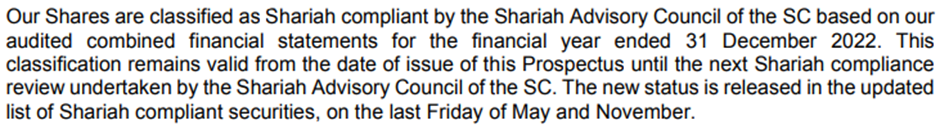 Status pematuhan syariah sesebuah IPO ditentukan oleh Majlis Penasihat Syariah (SAC) Suruhanjaya Sekuriti. Pelabur disarankan menyemak senarai terkini sebelum membuat keputusan pelaburan.
