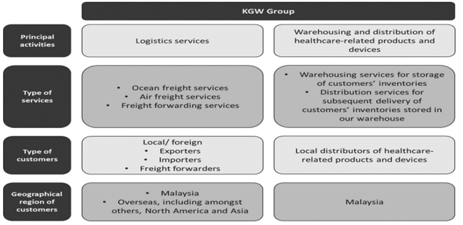 Syarikat ini mempunyai 3 pecahan untuk menjalankan aktiviti syarikat dibawah nama : KGW Logistics, KGW Medica dan Mattroy Logistics.