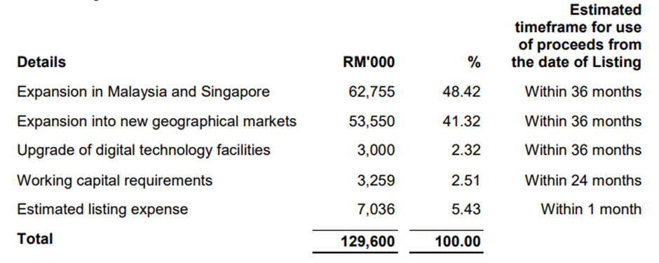 Sebanyak RM62,755,000 ataupun 48.42% daripada keseluruhan modal akan digunakan untuk mengembangkan lagi syarikat di Malaysia dan juga Singapura. Ini termasuk menaiktaraf dan memperbaharui kedai ‘retail outlets’ sedia ada dan juga ibu pejabat dan gudang syarikat yang berpengkalan di Subang Jaya, Selangor.