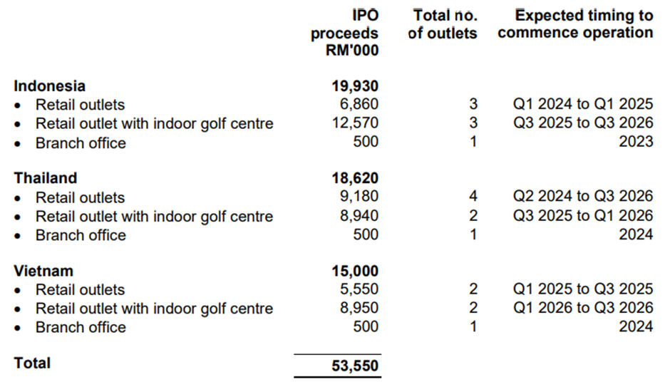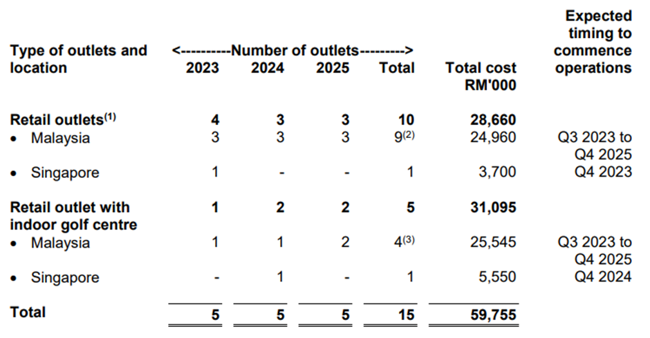 Sebanyak RM59.76 juta akan digunakankan untuk menambah 10 bilangan retail outlets dan 5 retail outlets yang menempatkan indoor golf centres. Perincian masa dan bilangan outlets adalah seperti berikut :