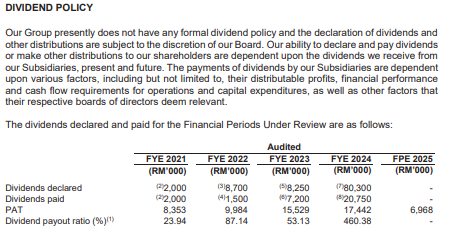 PMW pernah membayar dividen sebelum IPO, termasuk payout yang besar pada FY2024 kerana penyusunan struktur syarikat (pre-IPO restructuring).