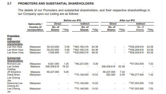 Berdasarkan bahagian “Directors and Substantial Shareholders”, pemegang saham utama selepas IPO ialah: