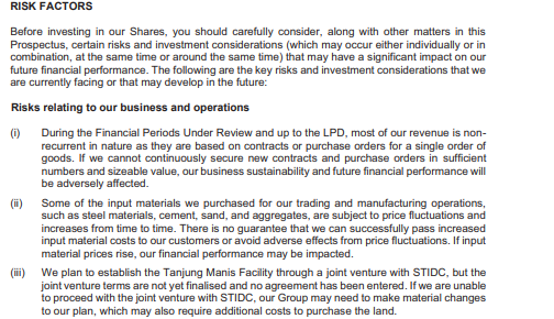 | ✅ Produk niche (spun poles, spun piles, moulds, machinery) — kurang pesaing langsung | ⚠️ Tiada polisi dividen selepas IPO (bukan dividend play) | 🤝 Peluang jadi pembekal ke syarikat utiliti besar / telco | 🔻 Persaingan harga dari syarikat industri konkrit lain |